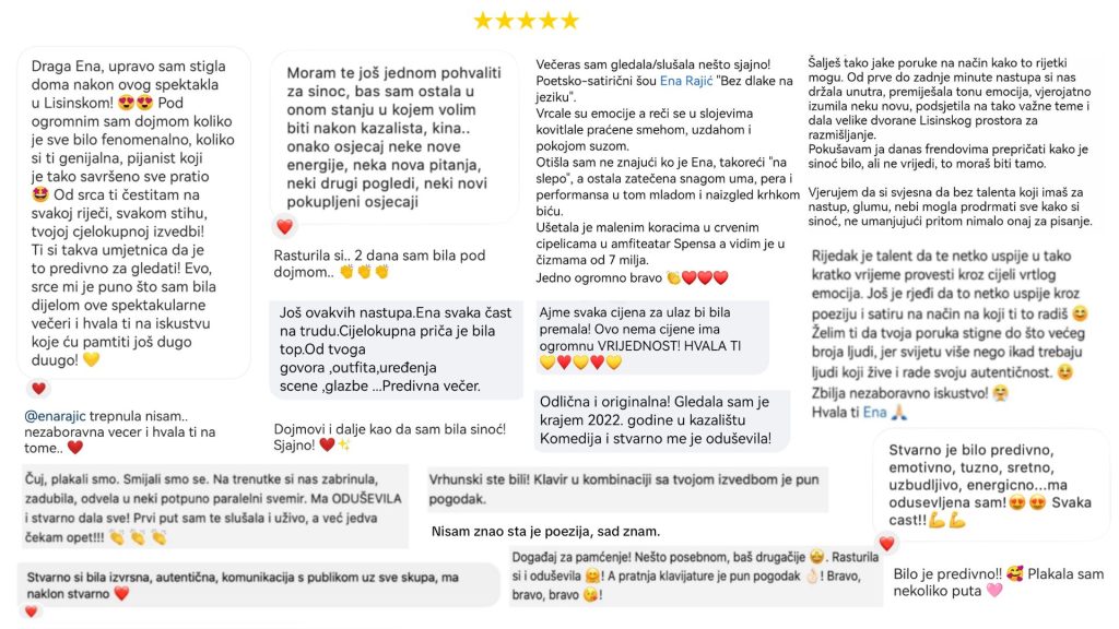 Svaki detalj je bitan, svaki stih pomno biran. Moje izvedbe nisu samo pozornica na kojoj uz satiru otvaramo važne psihološko-društvene teme, već i mjesto susreta osoba koje se usude pogledati ispod površine.